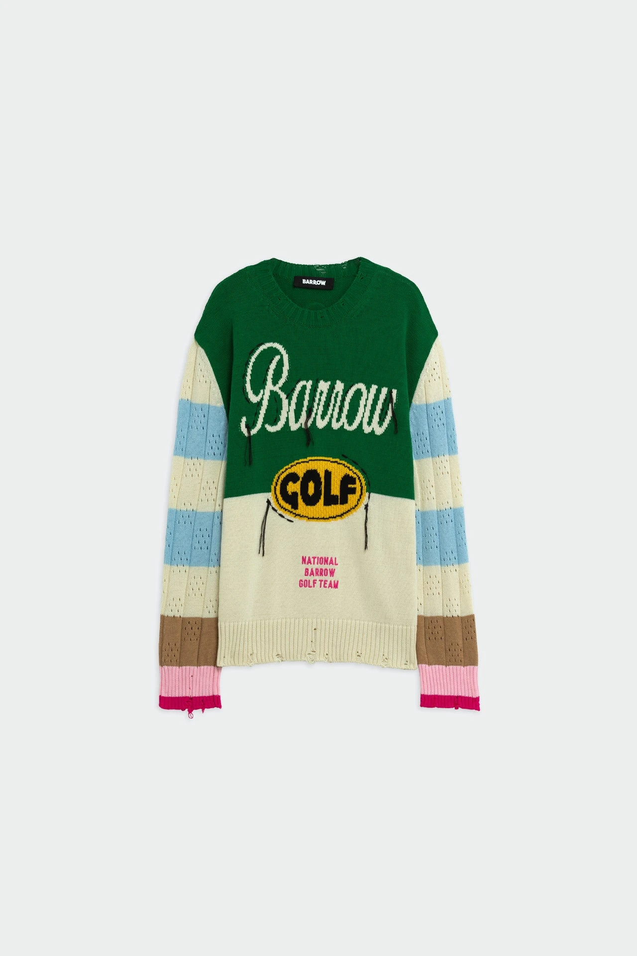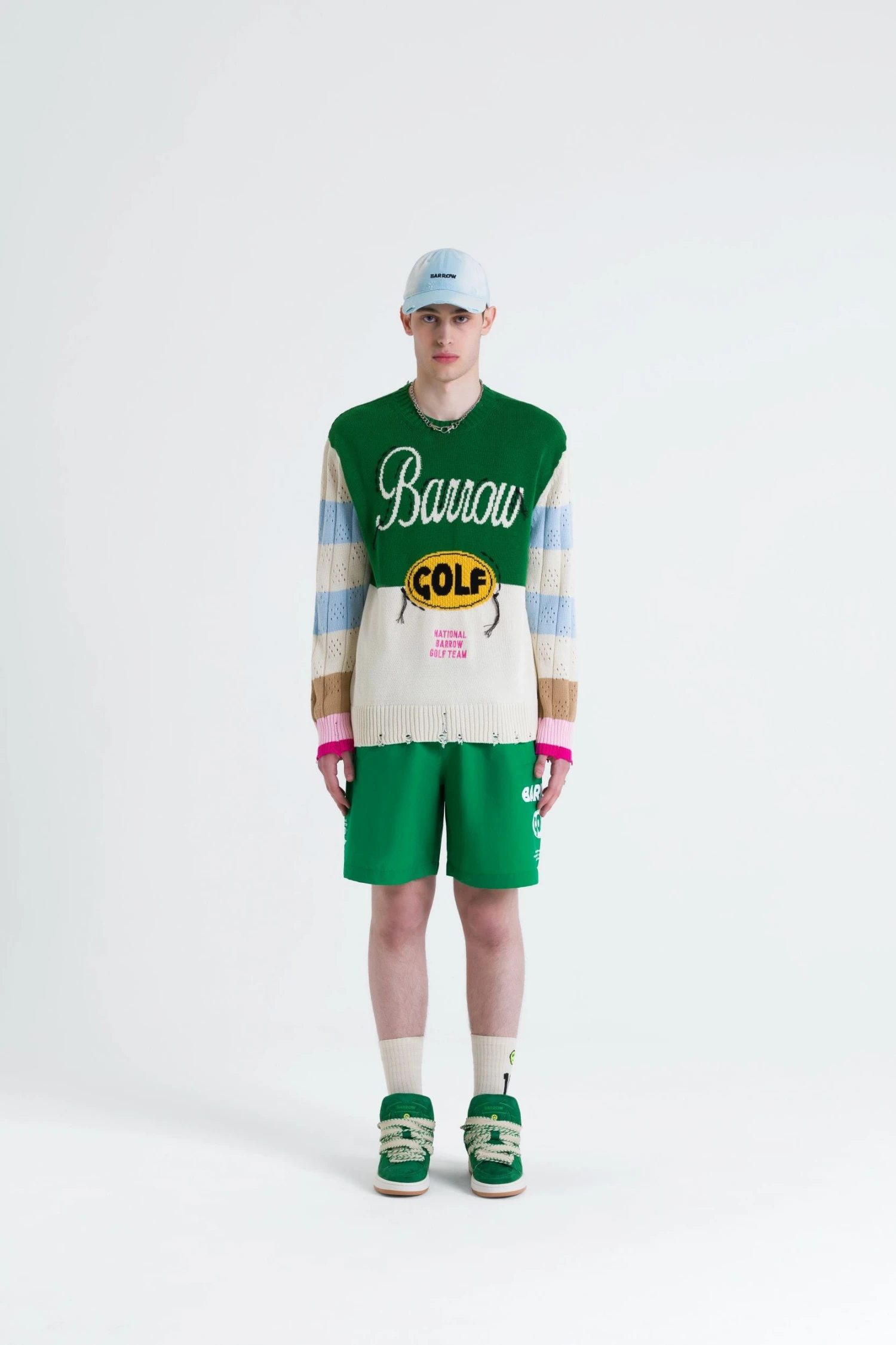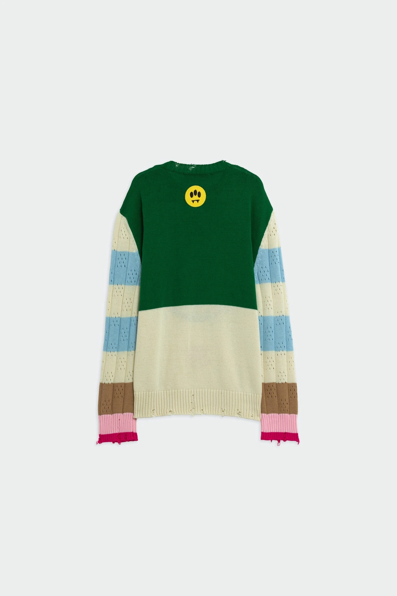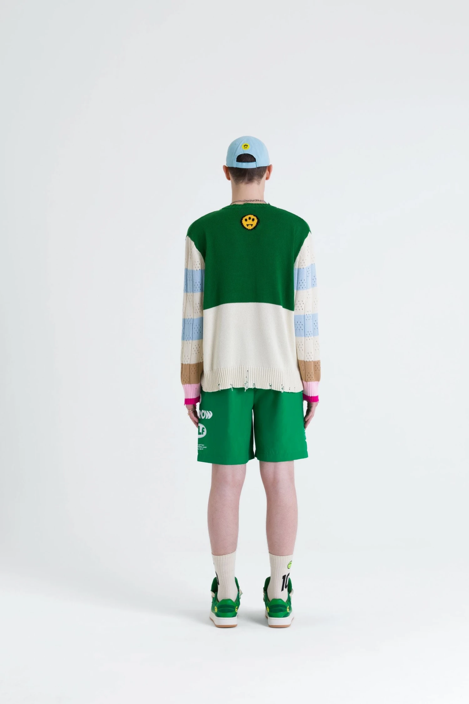 Maglia multicolor con maniche a righe a contrasto, ricamo Barrow sul petto e patch smile sul retro.