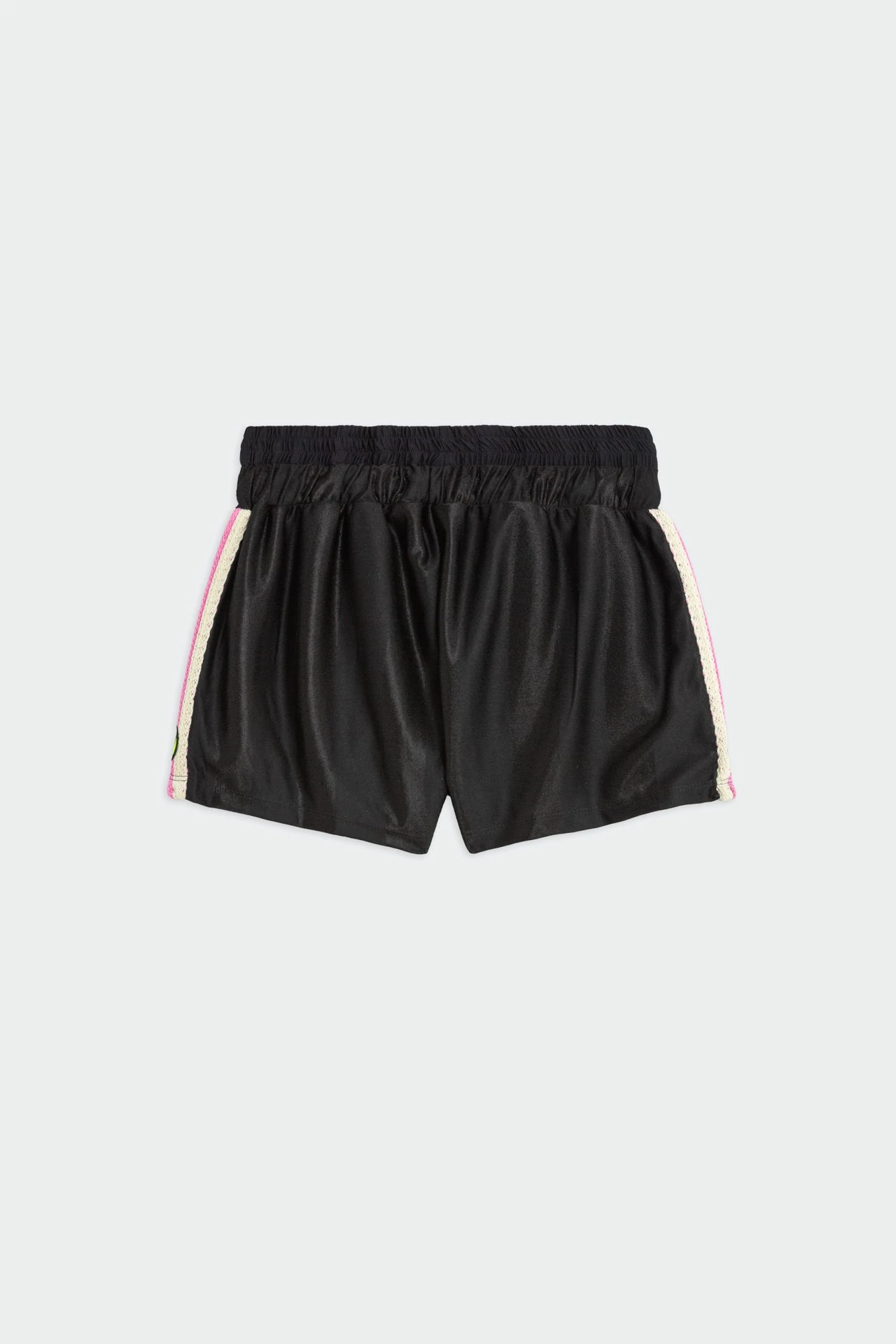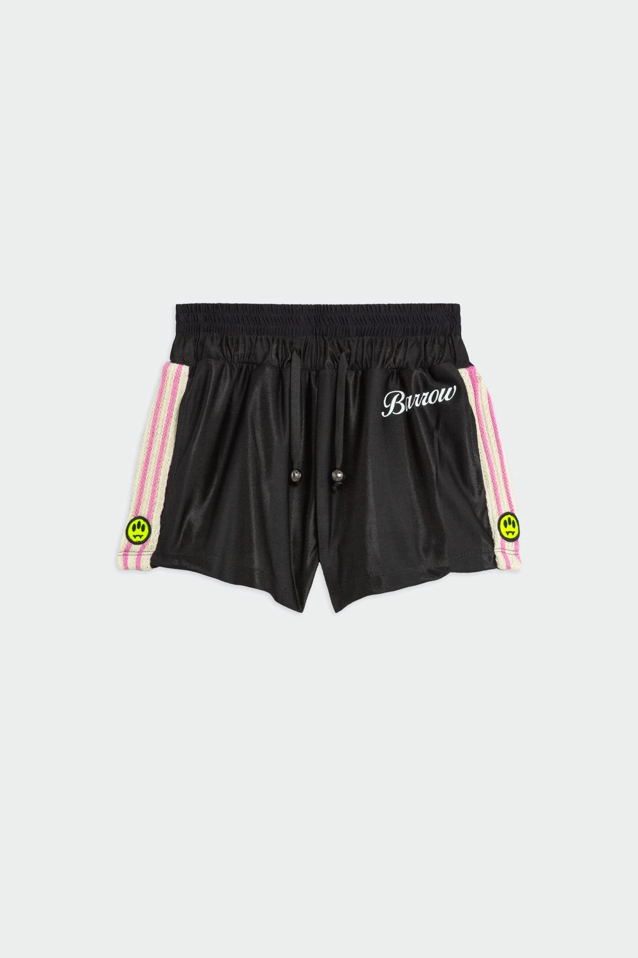Shorts in triacetato a righe tono su tono , vita elasticizzata, bande in maglia laterali a contrasto con patch Barrow.