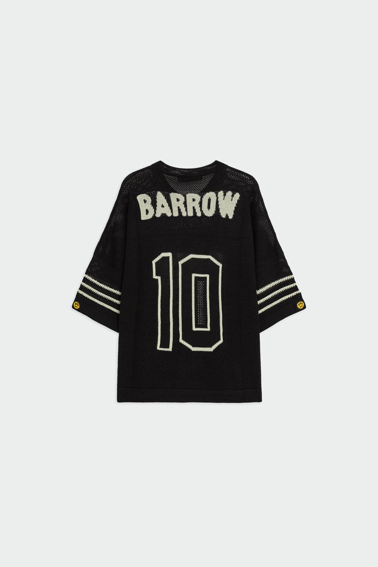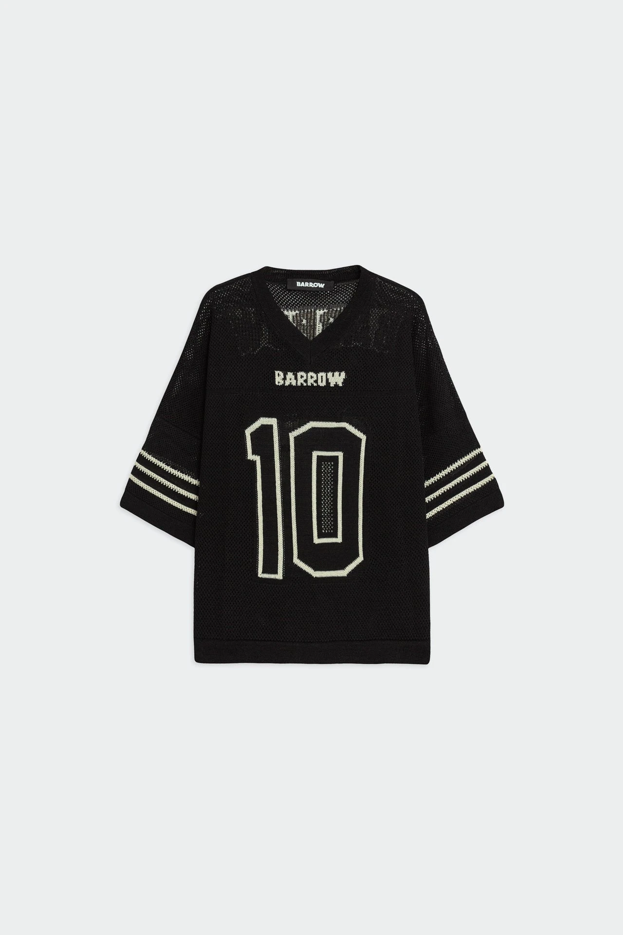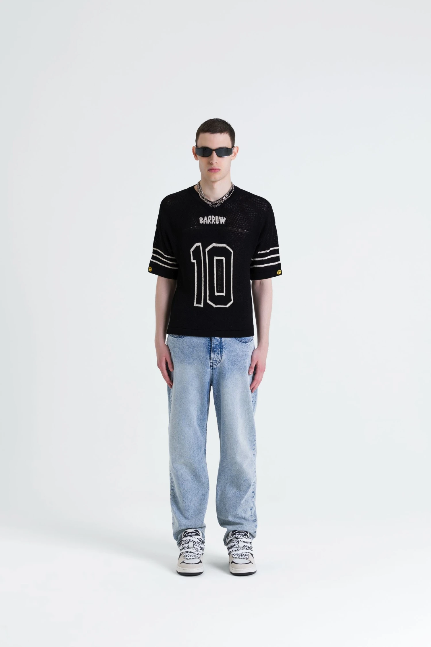 T-shirt lavorata a maniche corte con righe a contrasto, lettering e numero ricamato sul petto e sul retro.