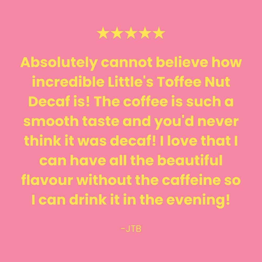 A smooth and rich coffee, gently infused with the taste of Toffee Nut. Our decaf coffee is gently decaffeinated using CO2, so no need to worry about nasty chemicals or solvents. Sleep well, folks!