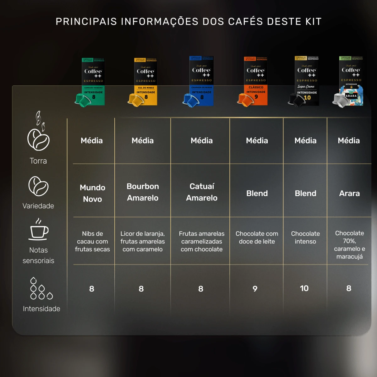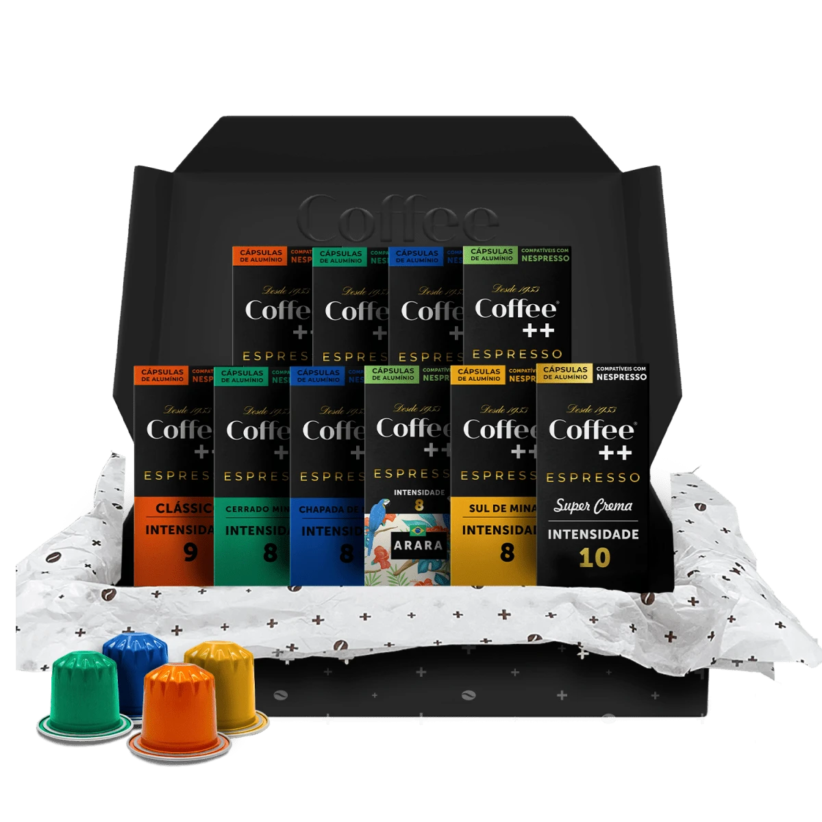 - INTESIDADE E SABOR – Experimente uma grande variedade de cafés superespeciais de origem única e notas sensoriais surpreendentes. Este Kit Coffee ++ inclui 10 embalagens de 10 cápsulas de cafés extraordinários. A sensação do café expresso com a praticidade que só a capsula pode oferecer.
