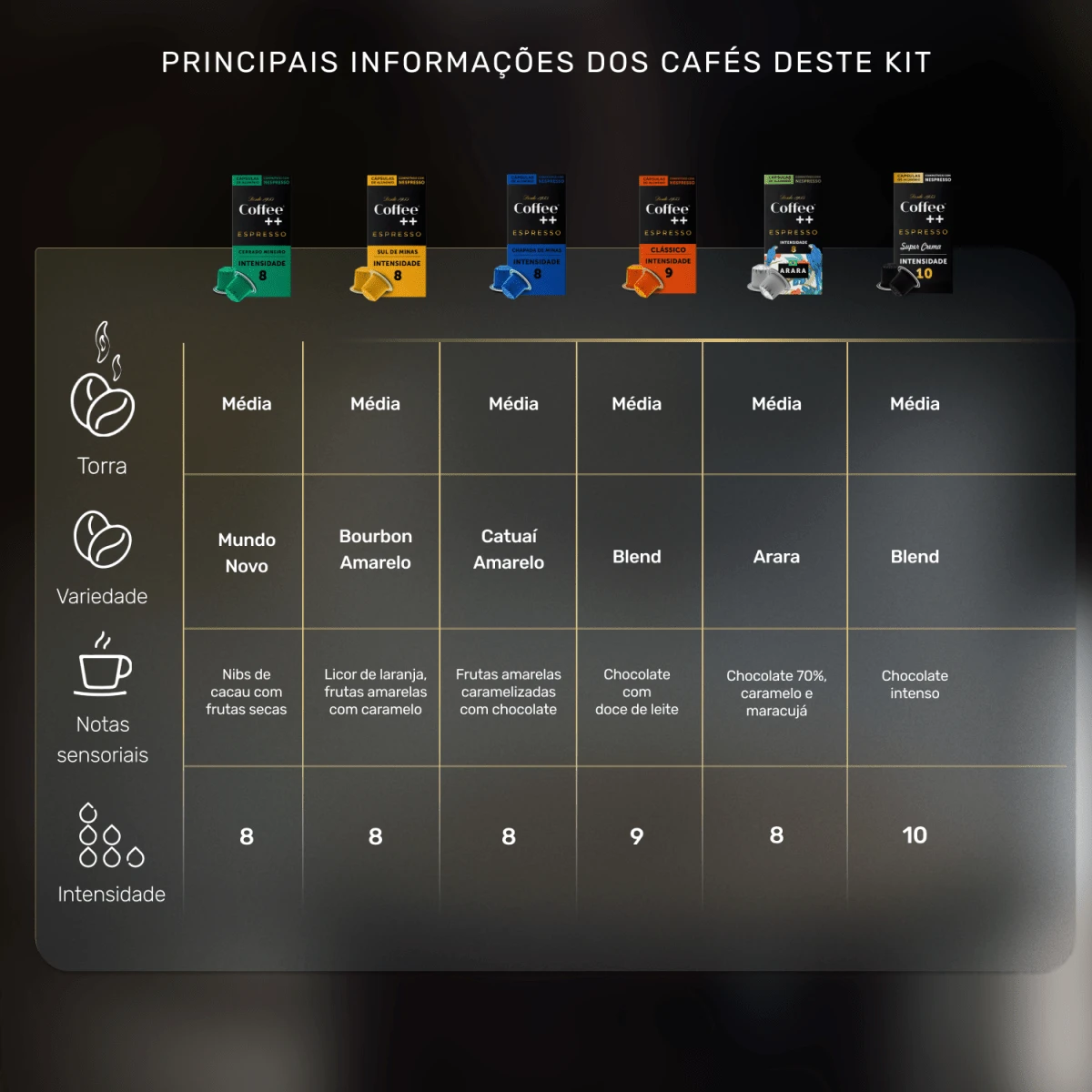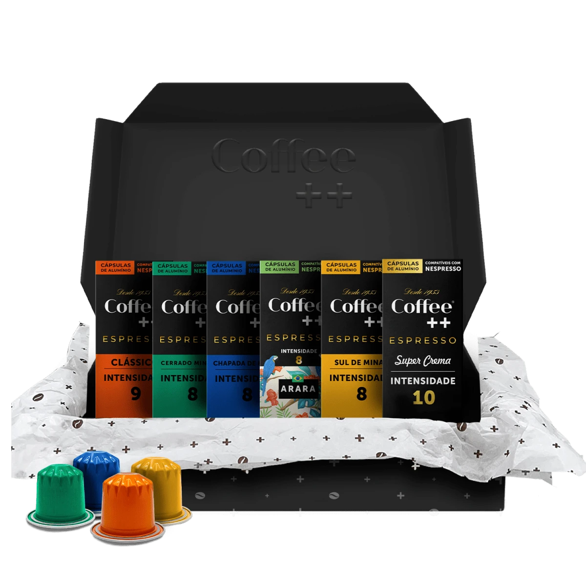 Desfrute de uma experiência excepcional de café com o nosso Kit de Café com cápsulas da Coffee ++, especialmente desenvolvido para os amantes dessa bebida tão apreciada em todo o mundo. Compatível com todas as máquinas Nespresso® (exceto Modelo Vertuo), este kit traz uma seleção cuidadosamente escolhida de 60 cápsulas de café, oferecendo uma variedade de sabores e intensidades para satisfazer todos os paladares.