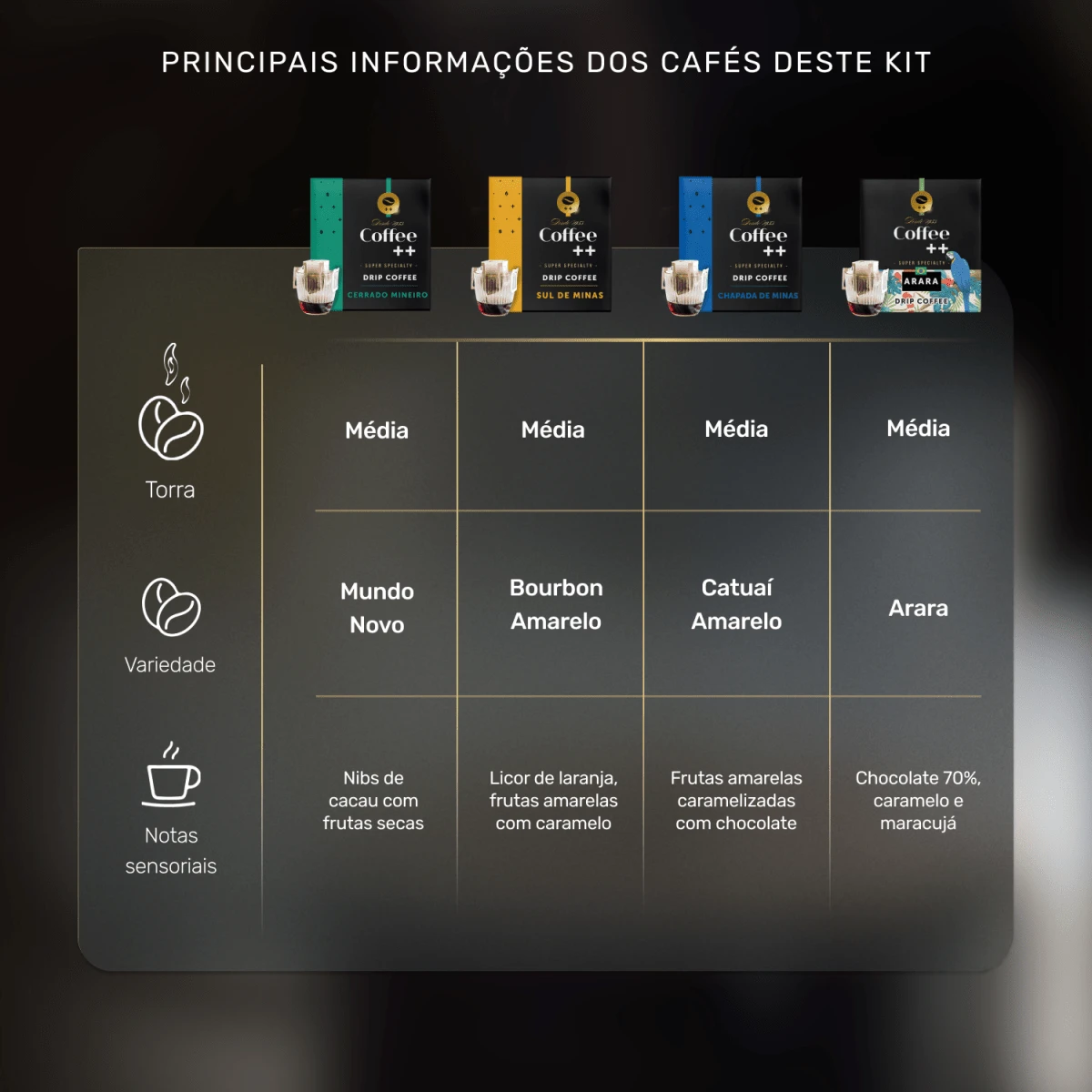 Conteúdo do Kit: 3 Drip Coffees Fazendas (Cerrado Mineiro, Mantiqueira de Minas, Chapada de Minas) + 1 Drip Coffee Arara